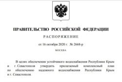 Распоряжение премьер-министра России Михаила Мишустина об утверждении комплексного плана мероприятий по обеспечению устойчивого водоснабжения Крыма датировано 16 октября. Но обнародовали его только 19 октября.